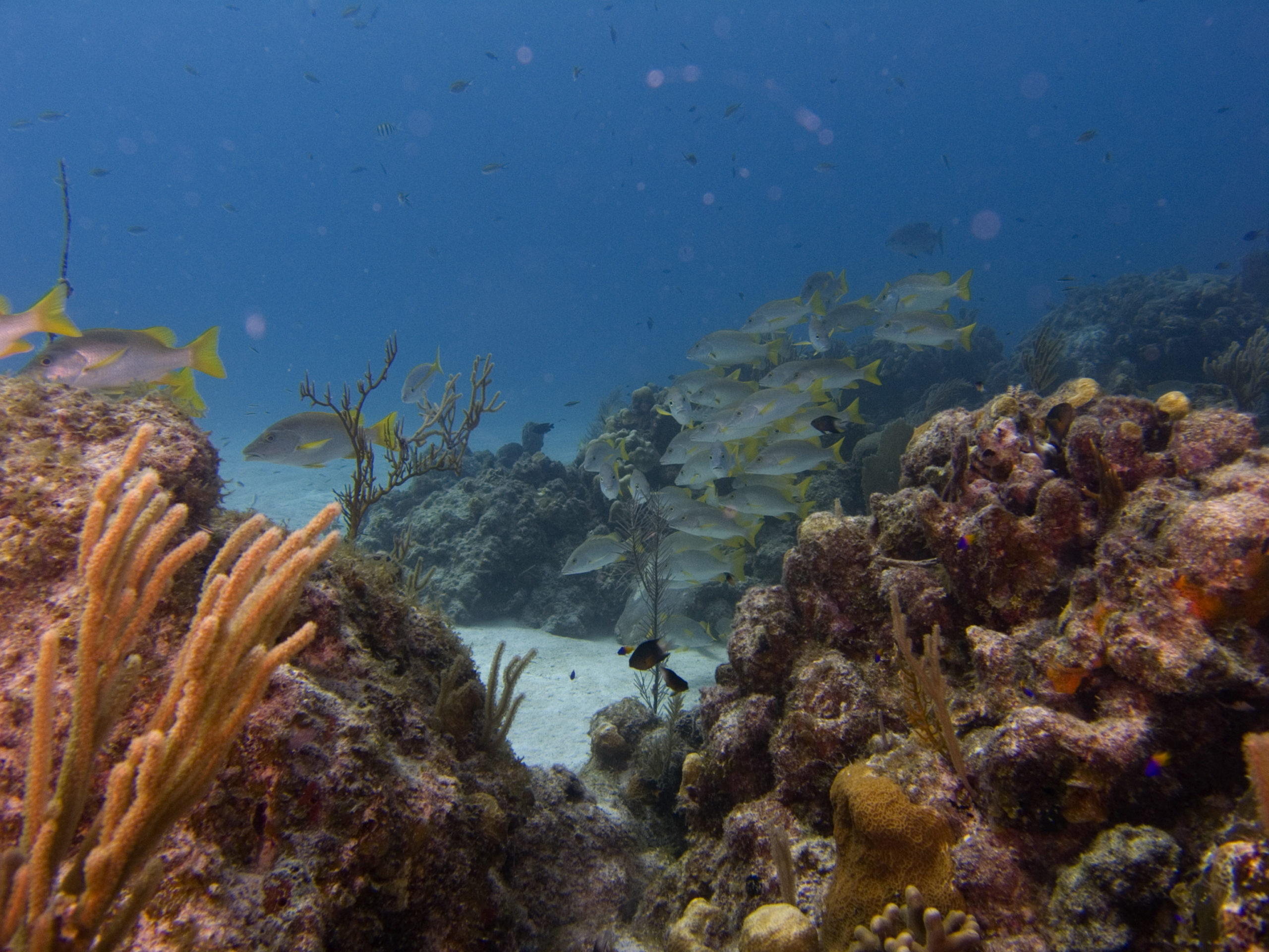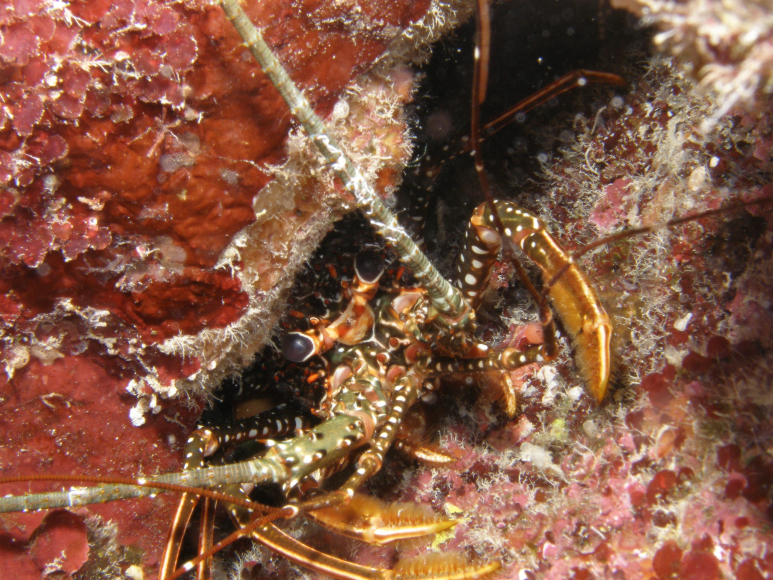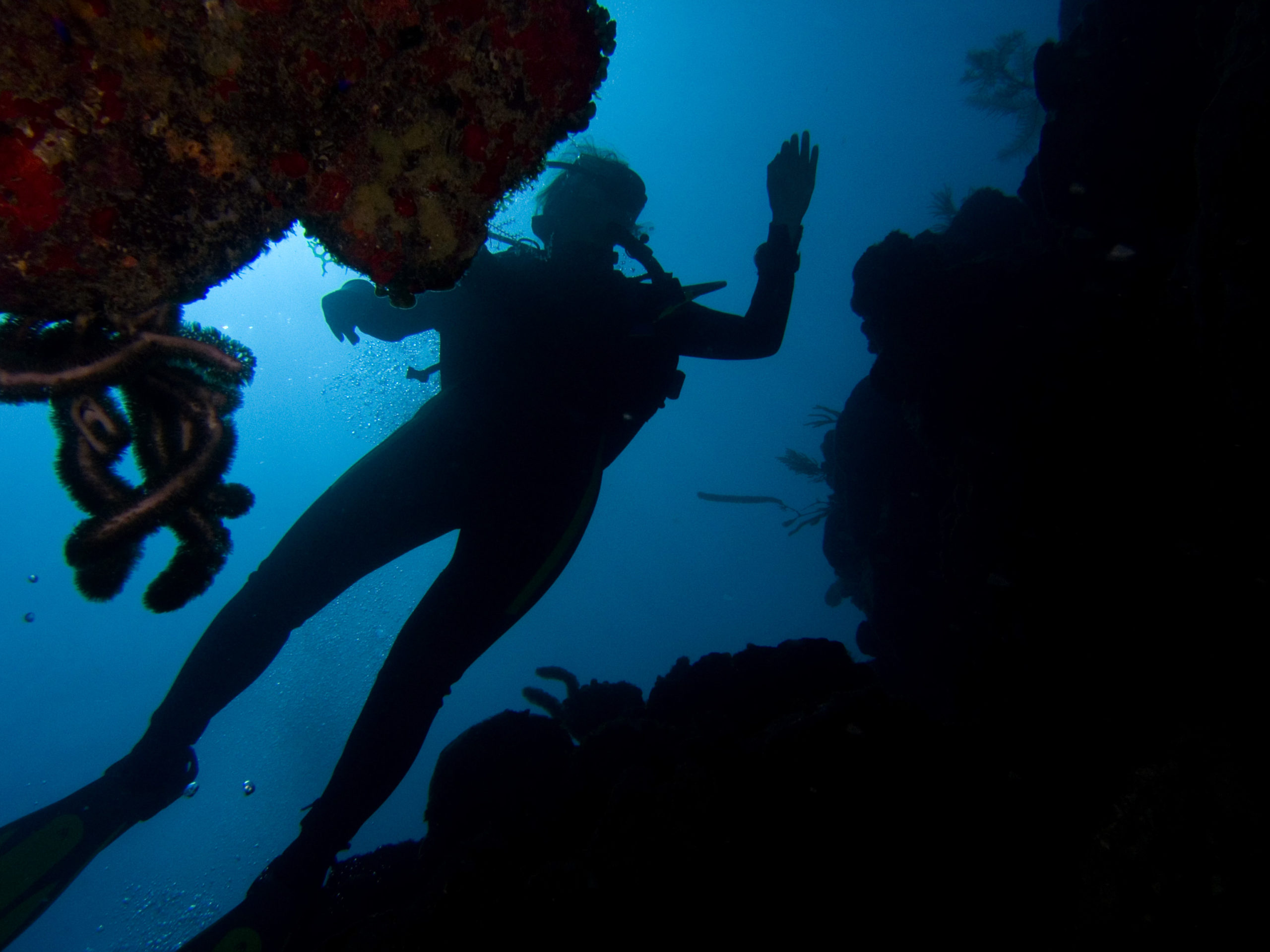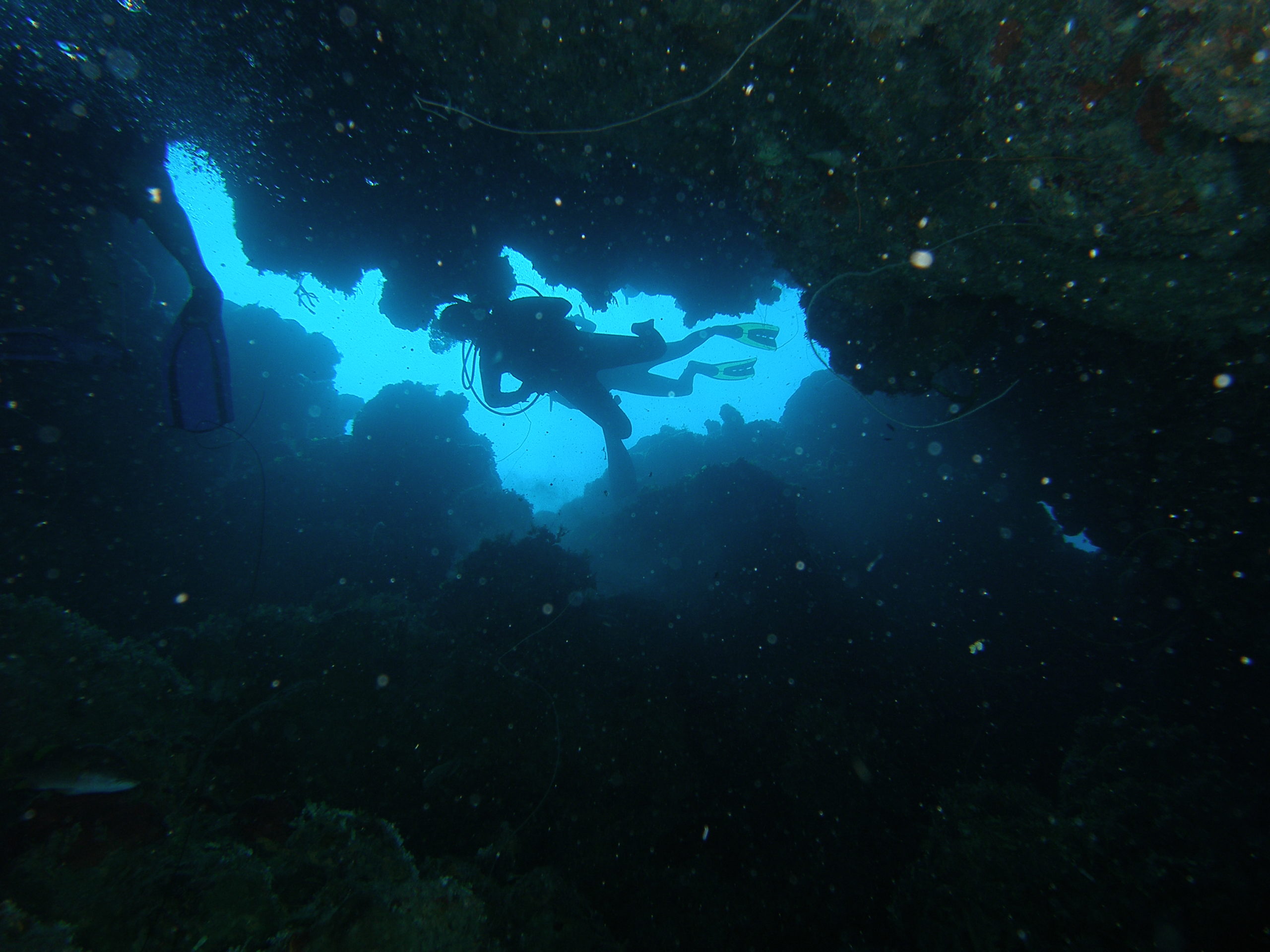 Kuba ist aus unserer Sicht nicht nur wegen des Tauchens eine Reise wert. Für uns stand Tauchen auch nicht im Mittelpunkt unserer Kuba-Reise. Über 3500 km sind wir innerhalb von 3 Wochen mit unserem Leihwagen gefahren und haben das Land erkundet. Zum Tauchen sind wir letztlich im Südwesten in Maria la Gorda gelandet. Dort gibt es ein vorgelagertes Saumriff, das zweitgrößte nach dem Great Barrier Reef in Australien übrigens. Auf der dem Land zugewanden Seite beträgt die Wassertiefe nur 8 bis 15m und es ist ein sandiger Boden mit einzelnen Korallenblöcken. Spektakulär sind die Höhlen und Canyons, die von der Innenseite durch das Riff auf die Aussenseite führen. Atemberaubende Lichteffekte führen durch das Riff direkt über das an der Ausseinseite befindliche Drop-Off. Diese Durchbrüche im Riff sind vor Maria La Gorda derart häufig zu finden, dass wir es am schönsten fanden immer wieder, quasi in Schlangenlinien, durch das Riff von Innen nach Aussen und wieder zurück zu tauchen. In den Canyons befinden sich kleine und große Langusten und Spinnenkrabben.